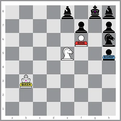 White PawnRook uses Rook vest power to capture h6, plunders Knight vest, check. Black King escapes check by moving to f8. White KingQueen moves to b4 and delivers checkmate by the power of it's Queen vest.