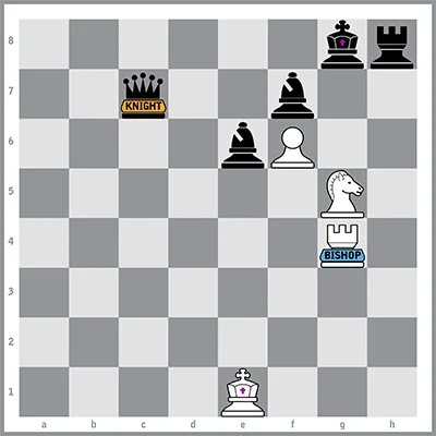 White Knight captures e6, plunders Bishop vest, check. (Note that check comes from white RookBishop on g4, a "discovered" check.) Black King moves to h7 (only option). White RookBishop moves to g7, checkmate.